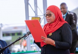 Mhe Dkt. Samia Suluhu Hassan akiapishwa na Jaji Mkuu wa Tanzania Mhe. George Mcheche Masaju kuwa Rais wa Jamhuri ya Muungano wa Tanzania katika sherehe zilizofanyika katika uwanja wa Gwaride Ikulu Cha...