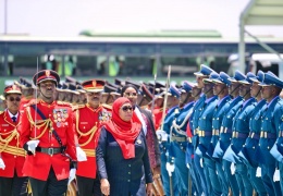 Rais wa Jamhuri ya Muungano wa Tanzania Mhe Dkt. Samia Suluhu Hassan akikagua Gwaride la Heshima la uapisho mara baada ya kuapishwa katika uwanja wa Gwaride Ikulu Chamwino mkoani Dodoma tarehe 03 Nove...